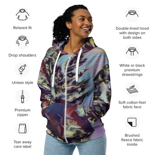 Unisex zip hoodie 'World on the Run 6a/9' artist-authorised edition of original artwork by Enmempin N. Midelobo
